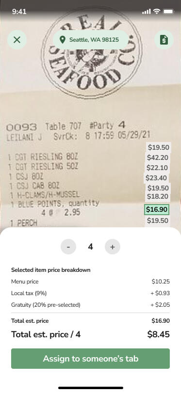 Calculate real prices with tax & tip includedLet you assign items to friends and split the bill fairly & evenlyHandle complicated group meals — without drama